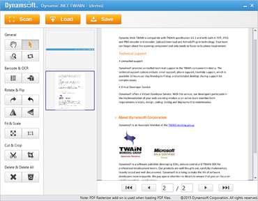Dynamic .NET TWAINは、.NETベースのデスクトップスキャンアプリケーション専用のTWAINコンポーネントです。 マネージコードのコンポーネントであり、あらゆるTWAIN対応デバイスから画像を取り込むことができます。 配慮の行き届いたインターフェイスとウィザードモードが組み込まれたDynamic .NET TWAINは非常に使いやすく、 ほとんどのTWAINジョブを数行のコードで実行できます。 TWAINドライバーがインストールされているスキャナー、デジタルカメラ、キャプチャ カードであれば、どれでも操作できます。 使いやすさを追求した高レベルの取り込み機能だけでなく、最も頻繁に使われるアプリケーションでも柔軟に制御できる低レベルの機能も備えています。